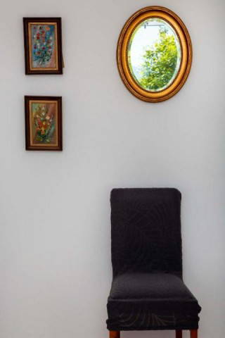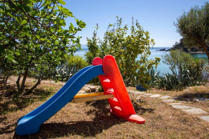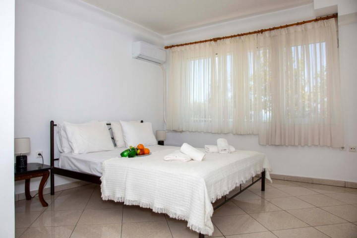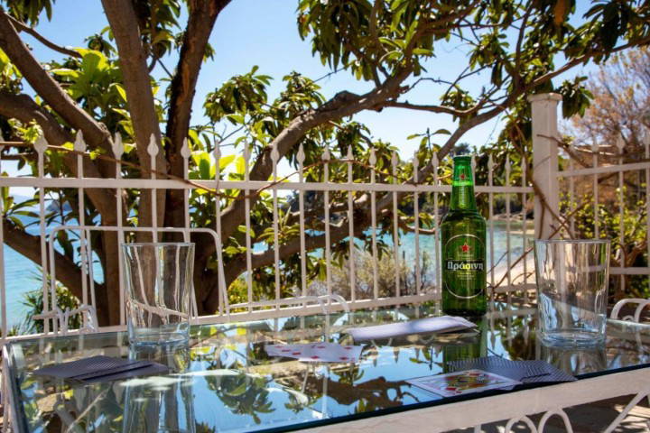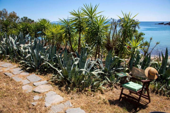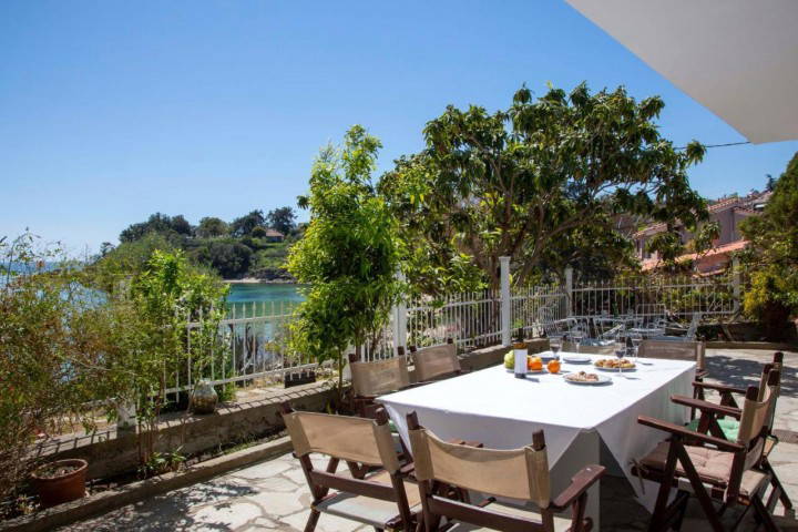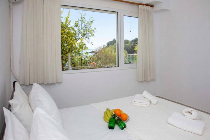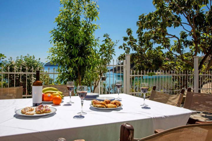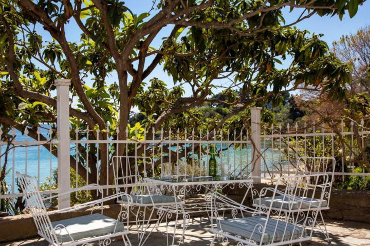 Outside, the courtyard opens directly toward the sea, offering uninterrupted views and immediate access to the shoreline. Summer evenings here are filled with sea breeze, golden light, and the soothing rhythm of the waves just steps away.